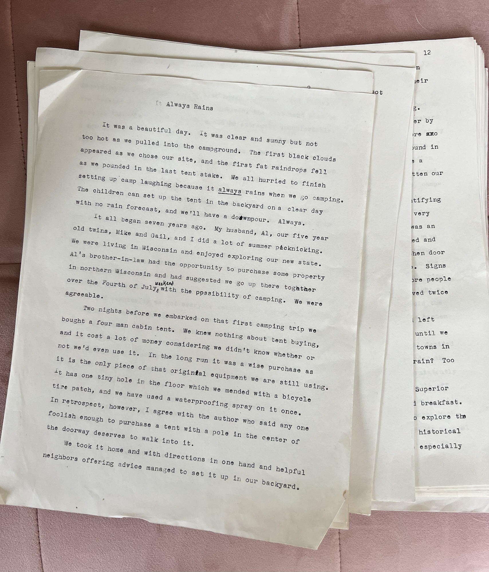 In doing some early spring cleaning, I ran across a treasure of Mama J’s—a typewritten account of some of our first family camping trips, beginning when Mike and I were five. I thought it might be fun to share these accounts with you here, to see where we all get our love of nature and the outdoors. NOTE: I have included minor edits (punctuation, mainly), but the text mostly remains as it appears in the original. The boldfaced subheadings/intros are mine.